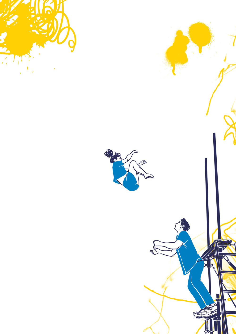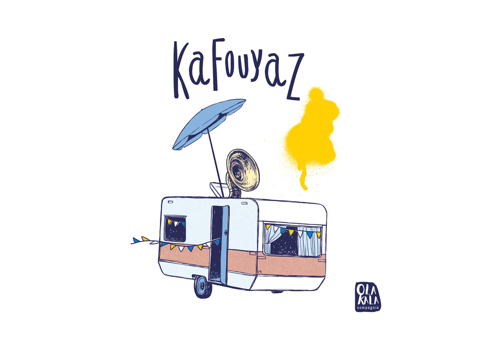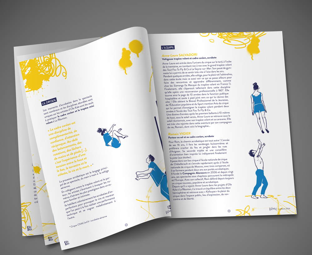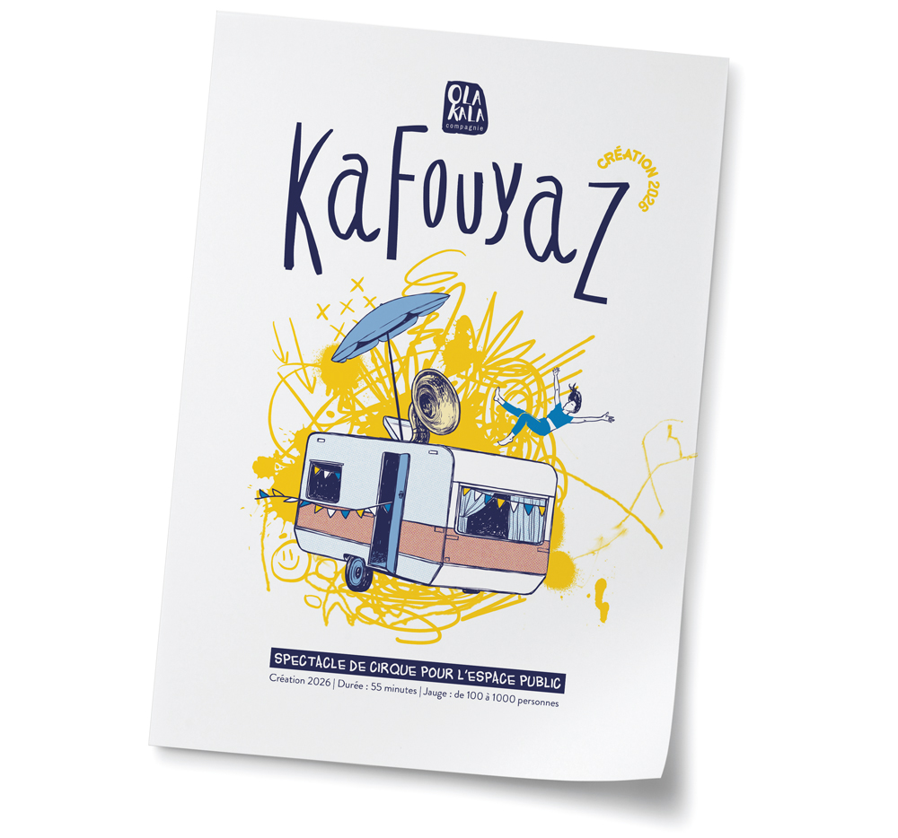 Création de mise en page graphique et illustrée, pour la présentation de Kafouyaz, le nouveau projet de spectacle aérien et décalé de la compagnie Ola Kala – Trapèze volant.