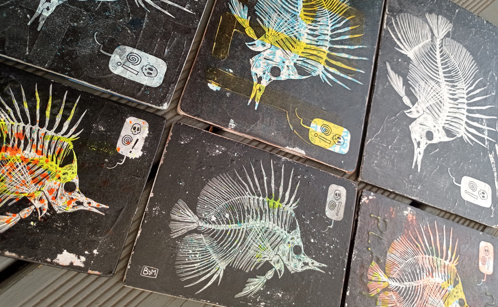 Captivée par les images en séries, Mayeule applique ses propres illustrations à des supports en moyens et petits formats (planchettes de bois et cartons de récup, papier), grâce à diverses techniques de reprographie artistique (transfert au médium acrylique, sérigraphie, risographie…).